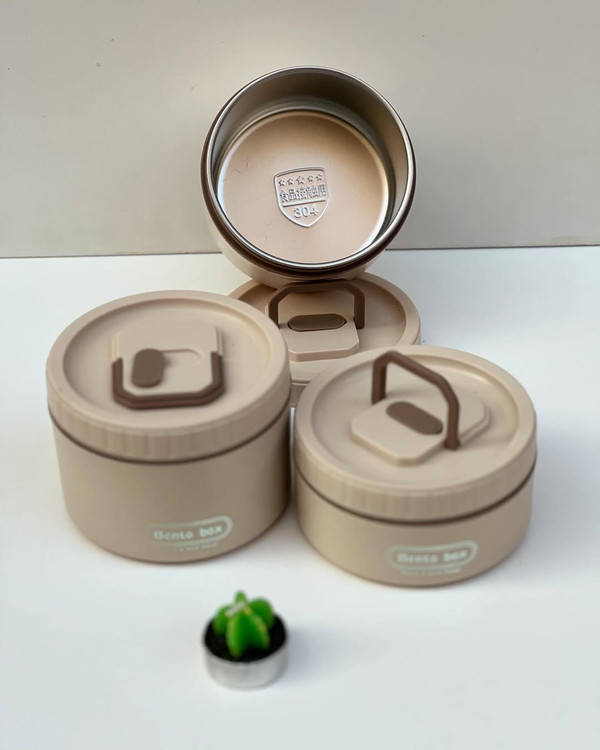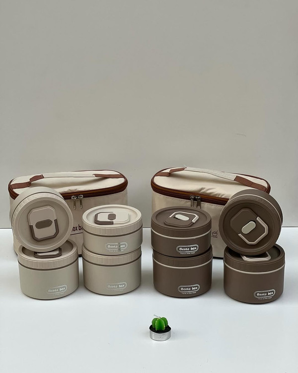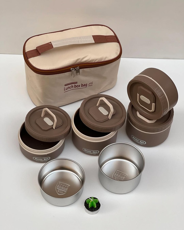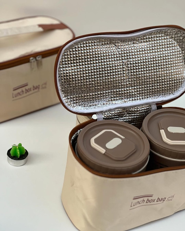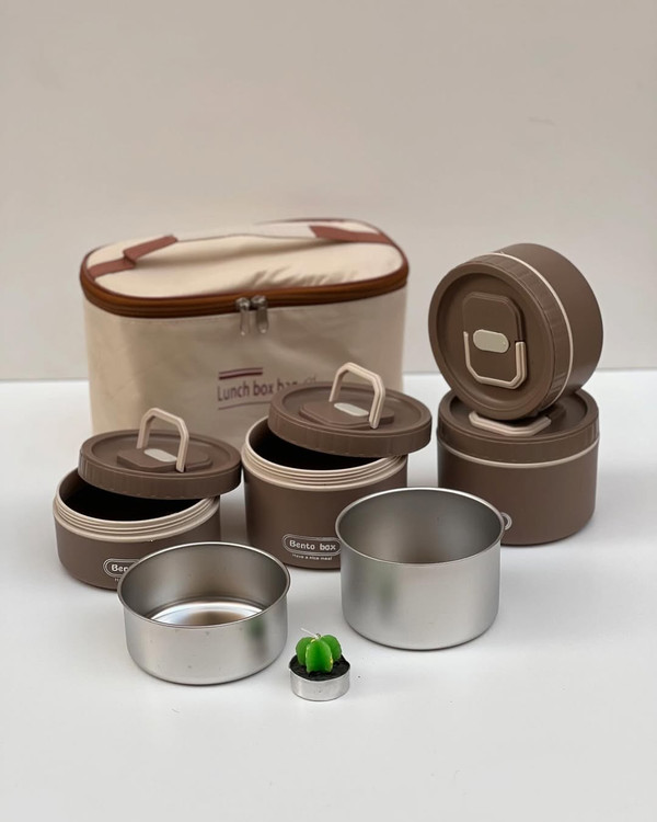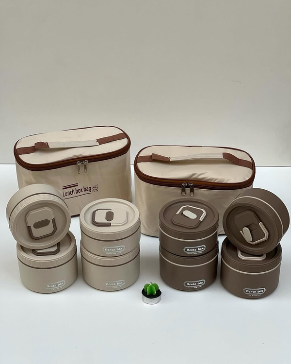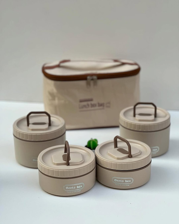 وبالاخره لانچ باکس ۴ قلو همراه فودبگ از برند BENTO استیل ۳۰۴ پنج ستاره محصول وارداتی و HIGH QUALITY برای مسافرت سرکار مدرسه کمپ و… جاداره و دیگه اصلاا گشنه نمیمونید صبحانه و میانوعده اتونو و ناهارتونو با خودتون میتونید حمل کنید ابعاد: دارای دو ظرف کوچکتر با حجم l هست و دو ظرف بزرگتر با حجم 550 ml هست در کل این ظرف غذا ها ۲ لیتر جادارند دارای کیف غذا و داخل آلومینیومی میباشد که نگهدارنده دمای سرد و گرم هستدیگه غذاتون گرم و سبزیجاتتون تروتازه میمونه قیمت: این ست پنج تیکه (دو ظرف داخل استیل کوچکتر و دو ظرف داخل استیل بزرگتر و کیف غذا) 1,185 تومن هست ویژگی ها: دارای ۴ ظرف غذا با در جدا داخل استیل ۳۰۴ پنج ستاره استیل جدا میشه هر ظرف دارای سوپاپ هوا هر ظرف دارای دسته تاشو برای حمل راحتتر محصول BPA FREE هست و فاقد مواد مضر و از خود مواد مضر بروز نمیدهد استیلو میتونید داخل فر بذارید(محفظه پلاستیکی رو داخل ماکرویو نذارید) لانچ بگ دارای لایه داخلی عایق الومینیومی لانچ بگ لایه بیرونی از جنس برزنت لانچ بگ دارای دستیگیره و زیپی ظرف های غذا دارای دو رنگ نسکافه ای و کرم